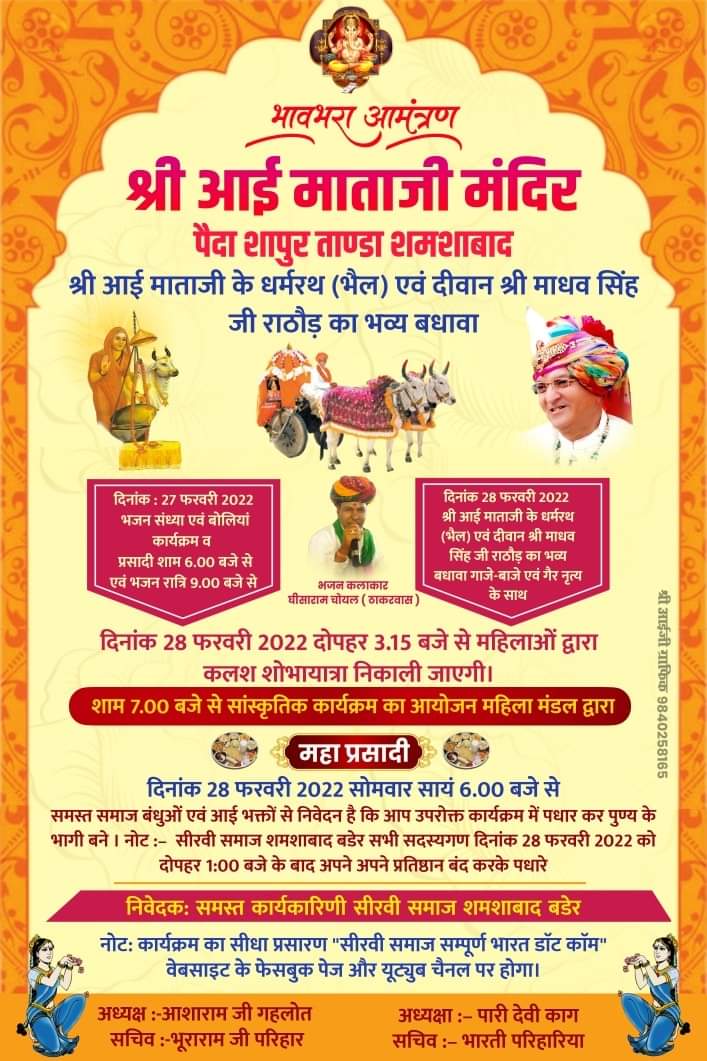समस्त समाज बंधुओं एवं आई भक्तों से निवेदन है कि आप उपरोक्त कार्यक्रम में पधार कर पुण्य के भागी बने ।