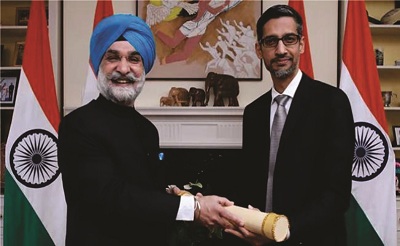 वॉशिंगटन, एजेंसी। अमेरिका में भारत के राजदूत तरणजीत सिंह संधू ने सैन फ्रांसिस्को में गूगल और अल्फाबेट के सीईओ सुंदर पिचाई को देश के सर्वाेच्च नागरिक पुरस्कारों में से एक पद्म भूषण मेडल सौंपा। संधू ने कहा है उन्हें पिचाई को पद्म भूषण सौंपकर खुशी हुई। मदुरै से माउंटेन व्यू तक की उनकी प्रेरणादायक यात्रा, भारत-अमेरिका आर्थिक और तकनीकी संबंधों को मजबूत करती है।